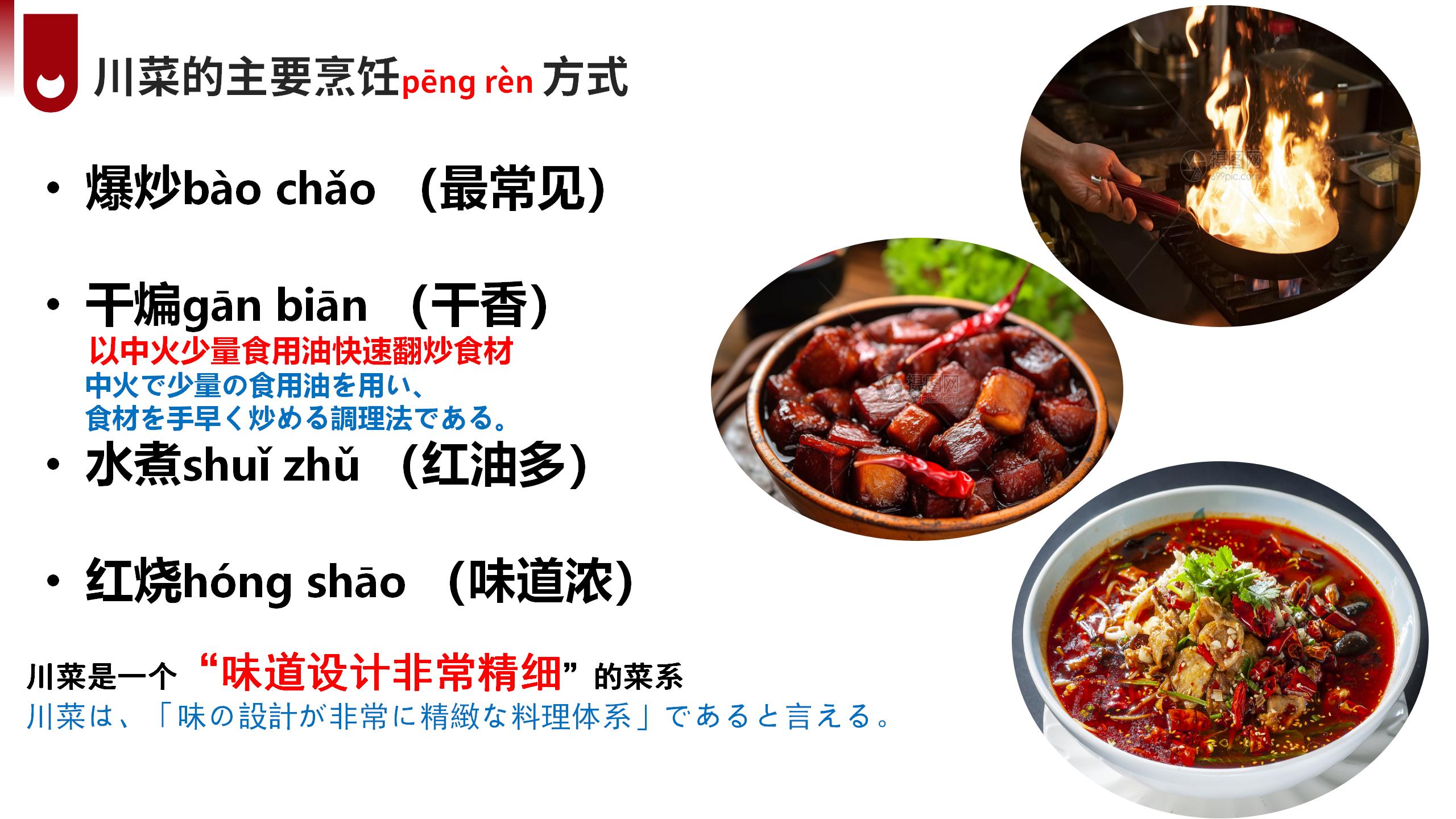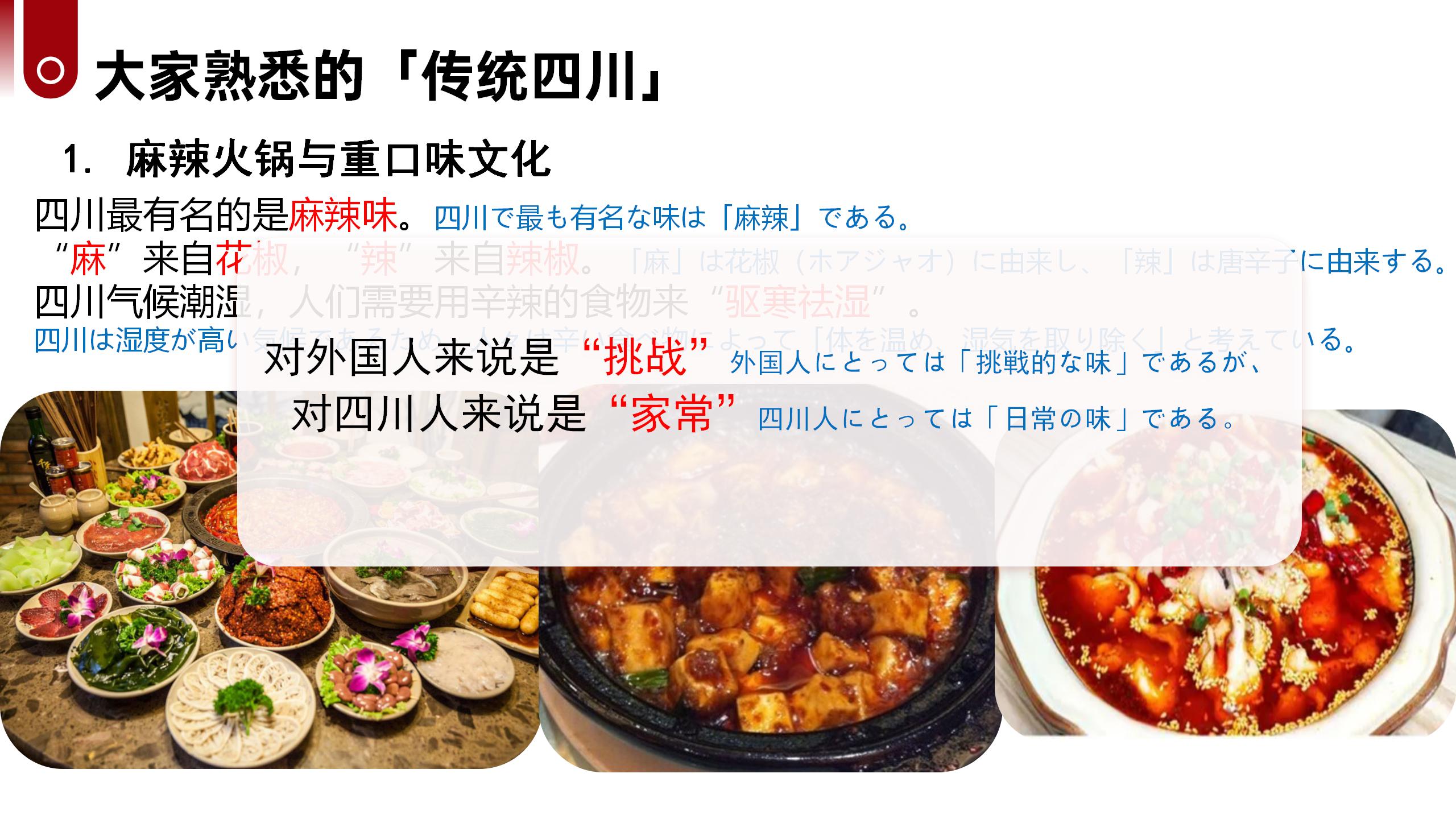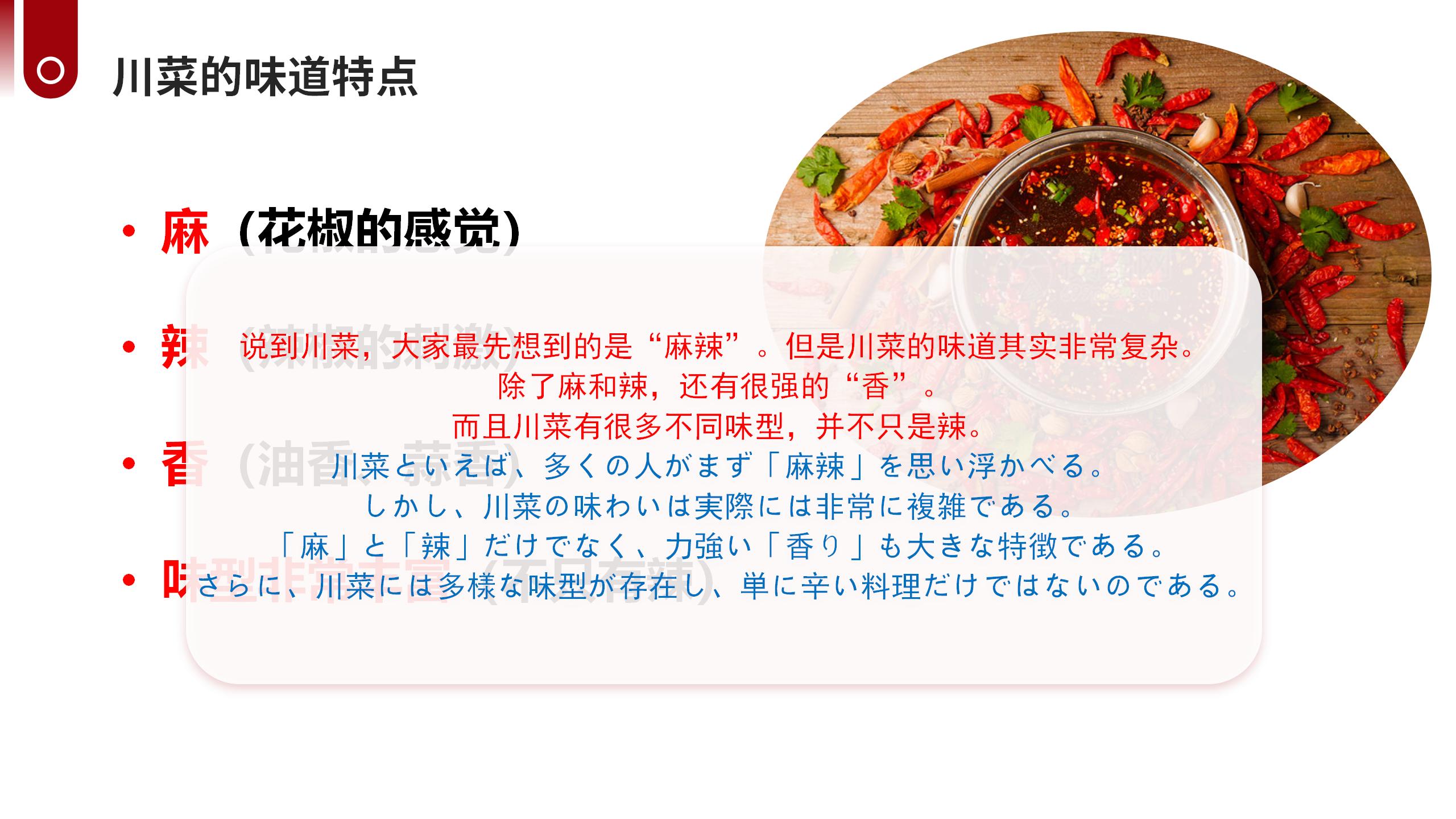 ホーム > サイトで中国語学習 > 第3期|川菜と四川文化を学ぶ中国語グループレッスンの振り返り 2026/04/01 四川はパンダが生息する神秘的で美しい大地!豊かな巴蜀文化と、熱気あふれる食文化が世界中で愛されています。日本でも親しまれている麻婆豆腐や担担麺をはじめ、四川料理は麻辣を軸とした独特な味わいと奥深い食文化を持ち、中華食文化の中でも際立った存在となっています。このたび、四川の伝統文化・歴史・風土、そして川菜の特徴や背景を深く学べる文化紹介クラスを開講いたします。料理を食べるだけでなく、その背景にある文化や歴史、人々の暮らしまでを知ることで、四川の魅力をより豊かに感じていただける内容となっています。 - サイトで中国語学習, 生活情報