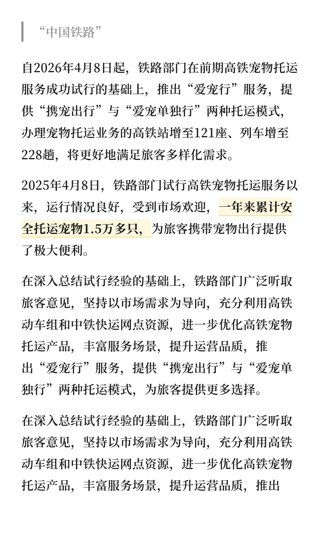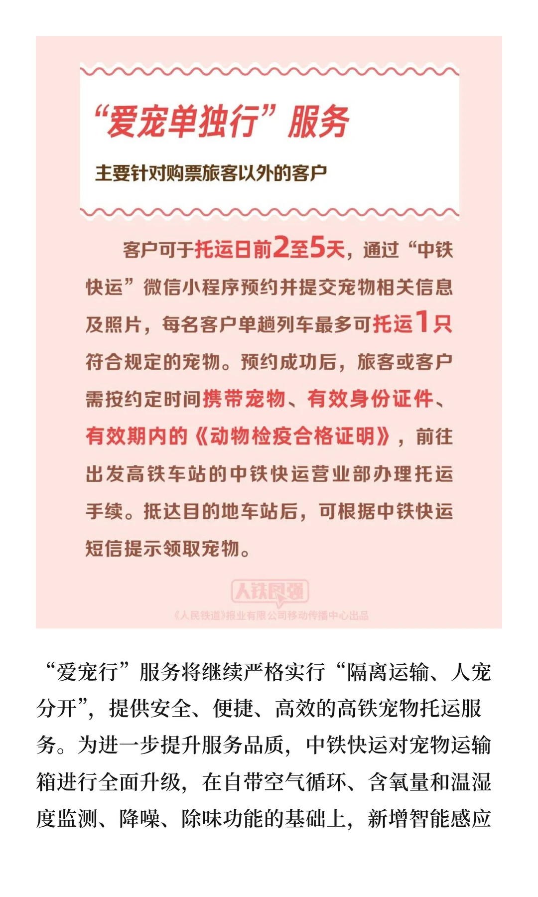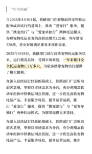 2026 年 4 月 8 日より、鉄道部門はこれまでのペット輸送サービス試行実績を踏まえ、「愛宠行(ペットと行く)」サービスを新たに開始します。
